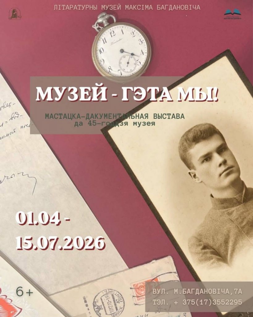1 красавіка а 17 гадзіне адбудзецца ўрачыстае адкрыццё мастацка-дакументальнай выставы “Музей – гэта мы!”, прысвечанай 45-гадоваму юбілею дзейнасці Літаратурнага музея імя Максіма Багдановіча. Запрашаюцца ўсе, хто жадае пазнаёміцца з цікавымі экспанатамі і гісторыяй установы.