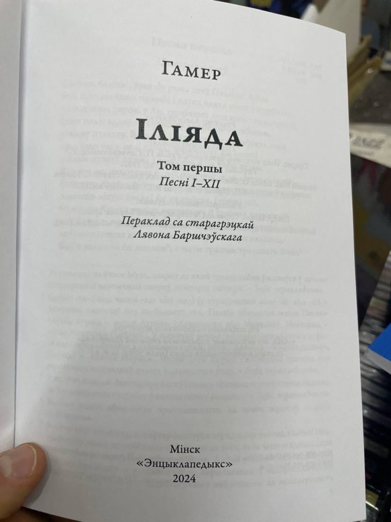 У выдавецтве “Энцыклапедыкс” выйшаў з друку першы том “Іліяды” Гамера, які ўключае 12 з 24 песень старажытнай гераічнай паэмы. Пераклад са старагрэцкай мовы здзейсніў філолаг і паліглот Лявон Баршчэўскі.