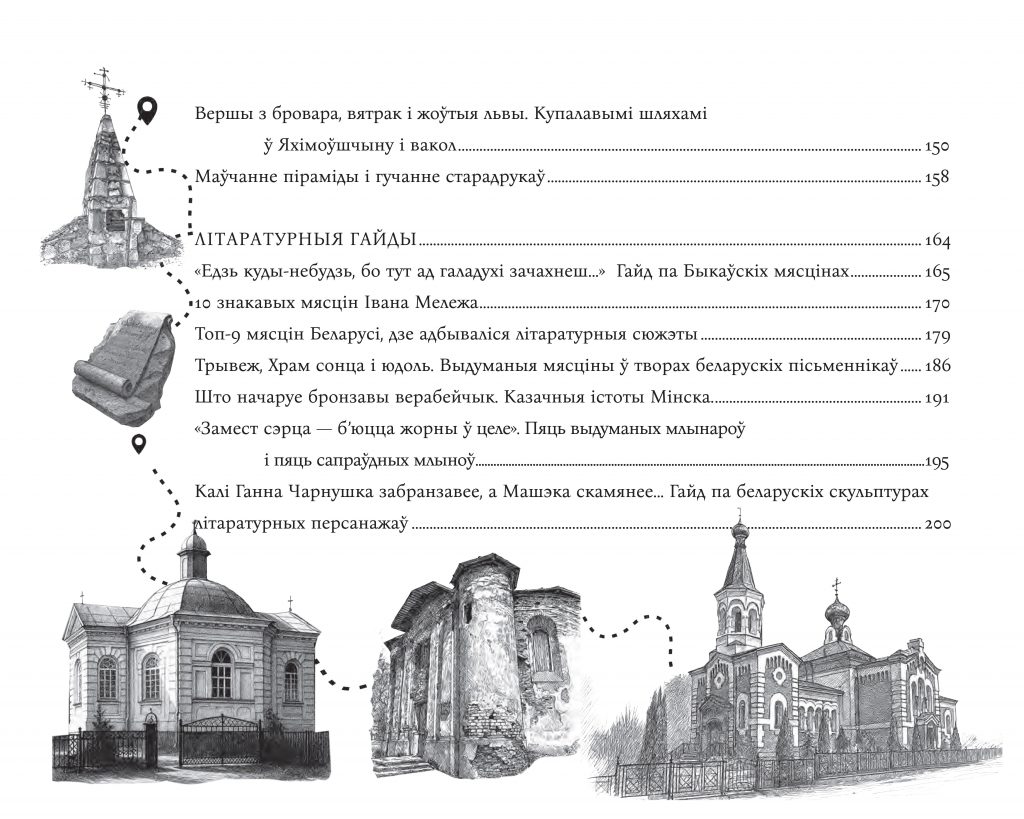 “Гатычны млын у Пагосце, дарога, брукаваная трылінкай, сядзіба вупыроў-Валадковічаў, якія спалі ўдзень, а працавалі ноччу, ягіпецкая піраміда на Уздзенскіх могілках і мамант на вяршыні Юравіцкай гары, маўрытанскі стыль палаца Козел-Паклеўскіх у Чырвоным Беразе і каменныя крыжы ў Межава.