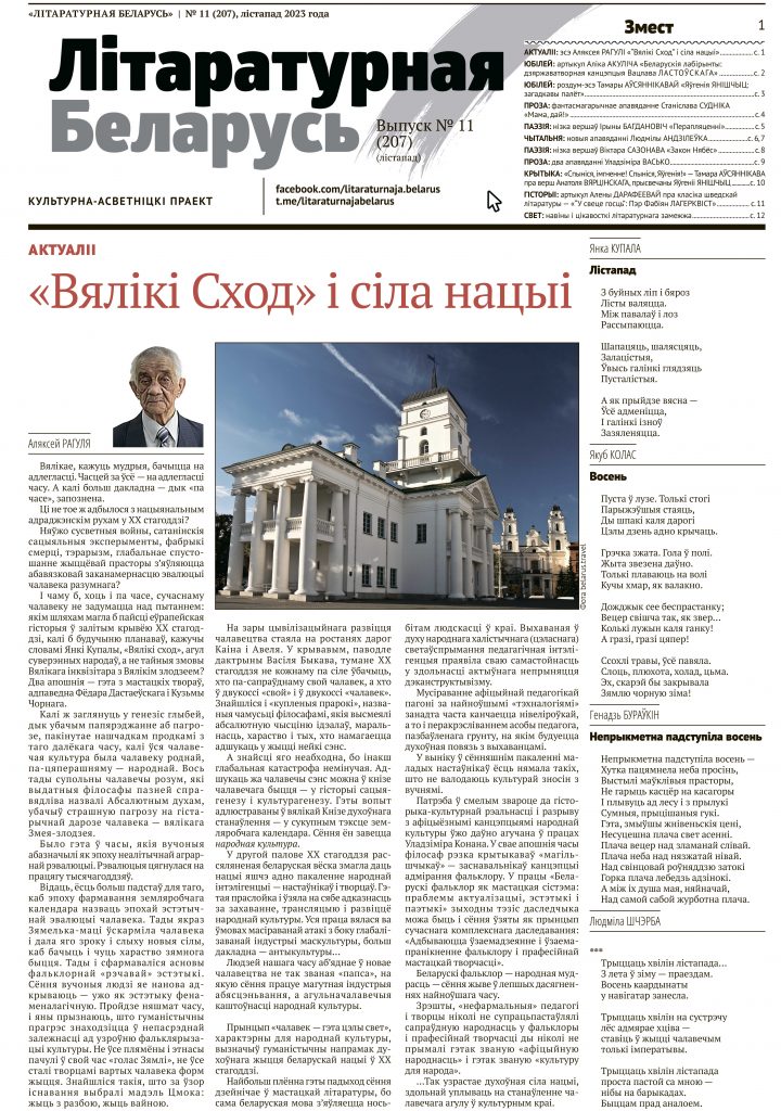 Выйшаў лістападаўскі нумар культурна-асветніцкага праекта «Літаратурная Беларусь» (цяпер распаўсюджваецца ў PDF-фармаце). Выданне друкуе навіны літаратурнага жыцця, эсэ і ўспаміны, навінкі з паэзіі і прозы.