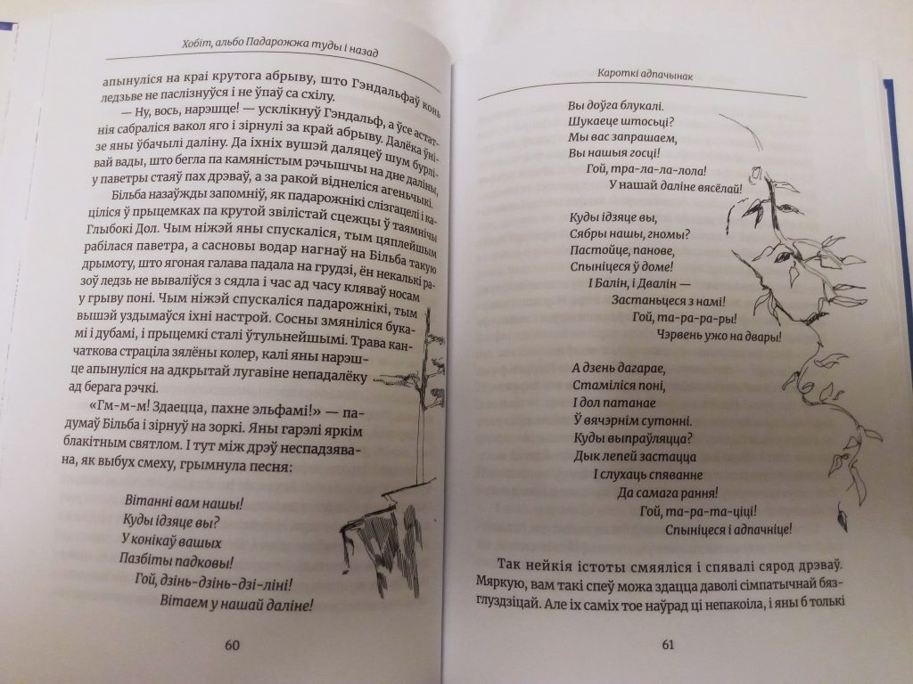 Вокладку для беларускага выдання “Хобіта” стварыла мастачка Ірына Дражына. Таксама кніга мае графічныя ілюстрацыі ўнутры, якія зрабіла Ганна Плотнікава. “Акрамя малюнкаў да кожнага раздзела, Ганна зрабіла больш за 100 дробных “замалёвак на палях”, быццам сам аўтар, пішучы тэкст, накідваў вобразы, што ўзнікалі ў ягоным уяўленні”, — расказваюць пра адметнасці выдання на старонцы “Кніжны рысь”.