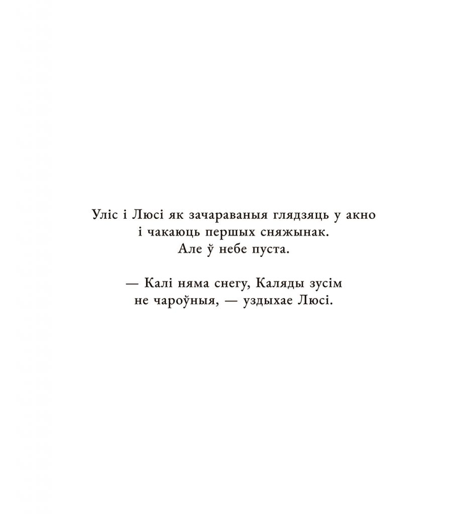 “Напярэдадні Калядаў маленькая Люсі і яе брат Уліс сумуюць: за акном — ніводнага снежнага воблака. «Калі няма снегу, Каляды зусім не чароўныя», — уздыхае дзяўчынка.