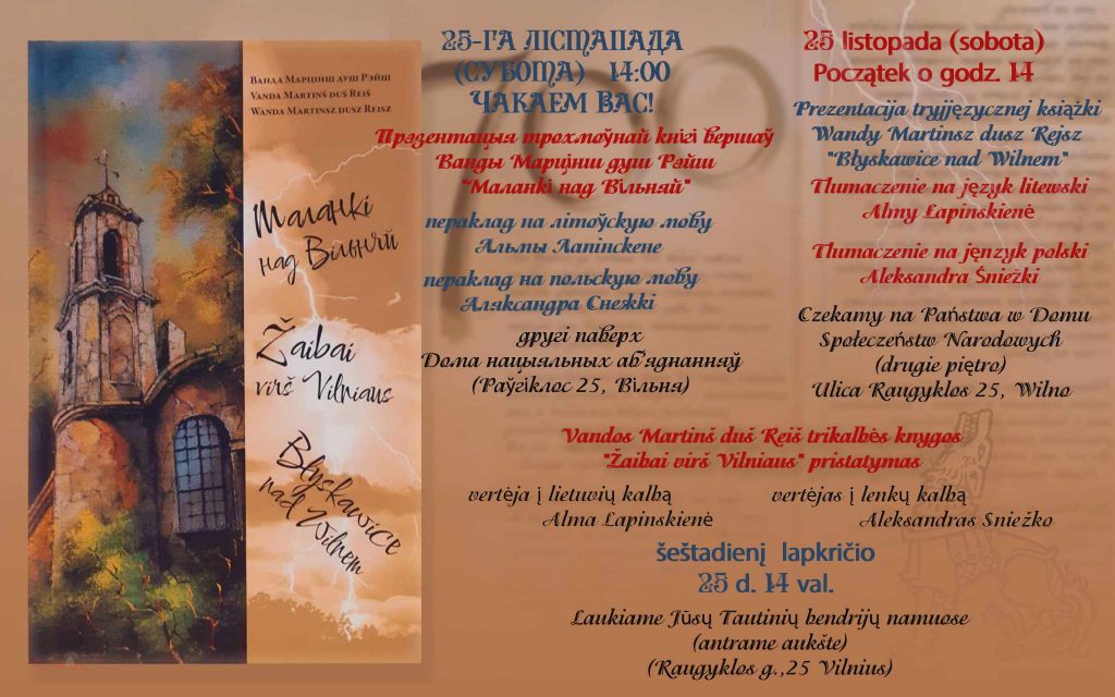 25 лістапада ў віленскім Доме нацыянальных аб’яднанняў (Raugyklos g. 25, другі паверх) адбудзецца прэзентацыя кнігі Ванды Марцінш душ Рэйш “Маланкі над Вільняй”, якую выдала фундацыя “Камунікат” (Беласток).
