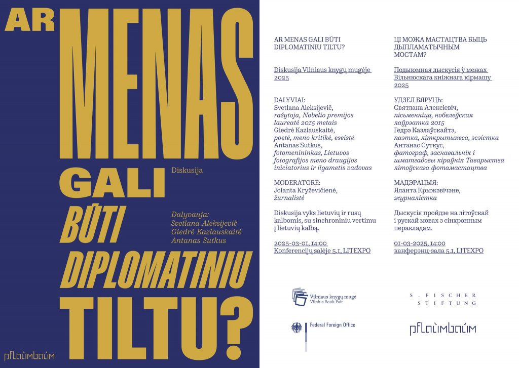 У дыскусіі з тэмай “Ці можа мастацтва быць дыпламатычным мостам?” крамя Святланы Алексіевіч возьмуць удзел паэтка, эсэістка, літкрытык Гедрэ Казлаўскайце і фатограф, кіраўнік Таварыства літоўскага фотамастацтва Антанас Суткус.