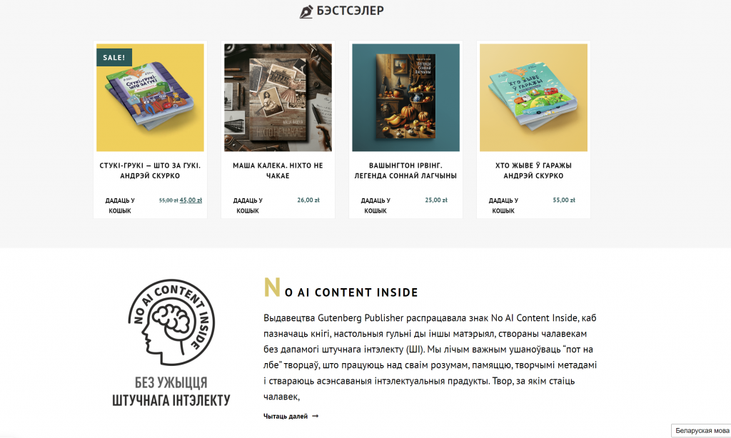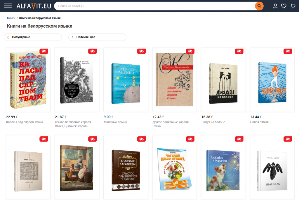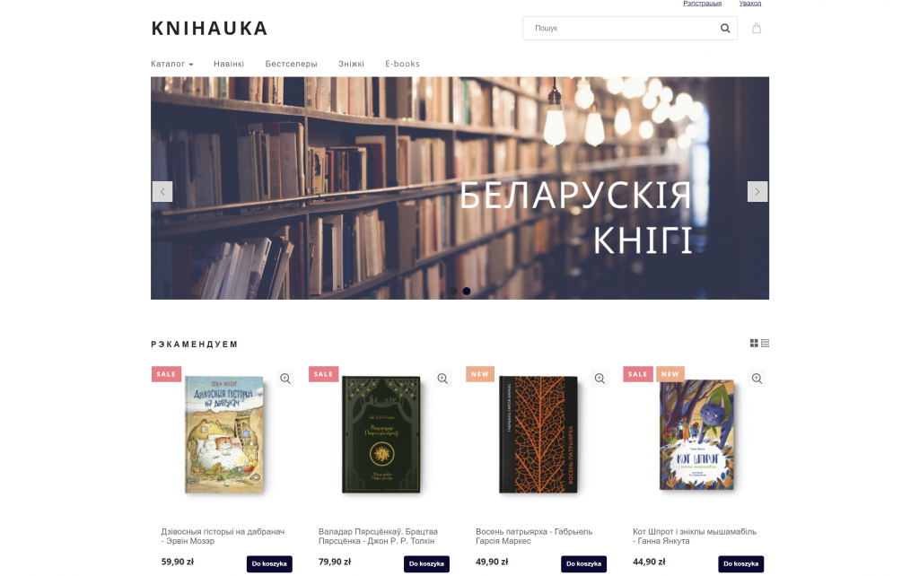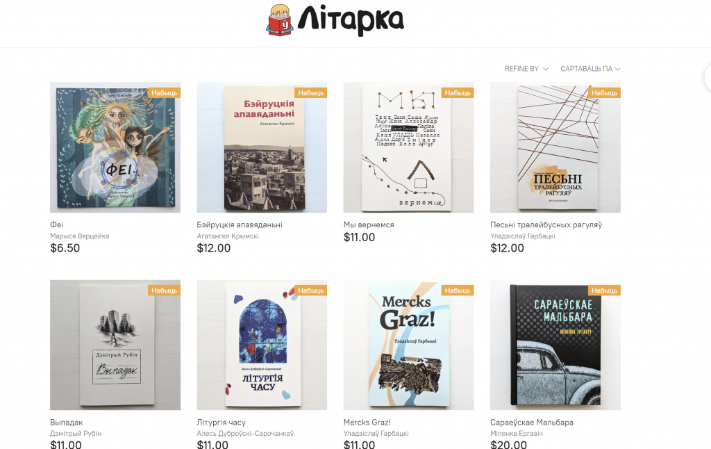Кнігі — на любы густ: у асартыменце кнігарні як творы вядомых і сучасных беларускіх аўтараў, як Альгерд Бахарэвіч, Ганна Янкута, Ева Вежнавец і іншыя, а таксама пераклады сусветнай літаратуры. Сярод іх, напрыклад, «Уладар пярсцёнкаў» Дж. Р. Р. Толкіена, «Вядзьмар» А. Сапкоўскага, «Гары Потэр» Дж.Роўлінг, «Вялікі Гэтсбі» Ф.Фіцджэральда. Ёсць і дзіцячыя кнігі на беларускай мове. У сакавіку выйшаў з друку беларускі пераклад польскамоўнай кнігі Ціны Азевіч «Што робяць пачуцці?» і другая частка фэнтэзійна-прыгодніцкага раману Валера Гапеева «Вольнеры». З нядаўняга часу на сайце можна купляць і электронныя кнігі.