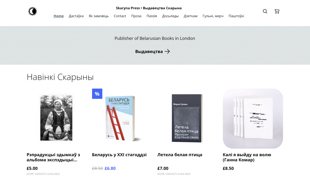 Гэты сайт адрозніваецца ад папярэдніх тым, што ён дастаўляе кнігі ў Злучаныя Штаты. Сярод самых папулярных кніг мінулага года кнігарня залічвае «Айчына. Ілюстраваная гісторыя Беларусі ад Рагнеды да Касцюшкі» на ангельскай мове Уладзіміра Арлова, «Сабакі Эўропы» і «Апошняя кніга пана А.» Альгерда Бахарэвіча, «Радзіва Прудок» Андруся Горвата, але гэта дакладна не ўсе цікавыя кнігі, якія можна набыць.