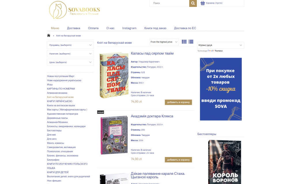 Кнігарня існуе як анлайн, так і стацыянарна ў Варшаве. Тут можна набыць кнігі на беларускай, украінскай і расійскай мовах. У раздзеле з кнігамі па-беларуску можна знайсці кнігі дзіцячай і класічнай беларускай літаратуры выдавецтва «Папуры».