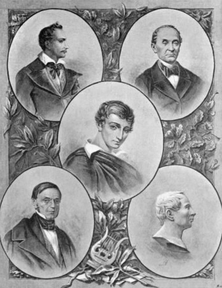 Філаматы і філарэты: Тамаш Зан, Ігнат Дамейка, Адам Міцкевіч, Антоні Эдвард Адынец, Ян Чачот, карціна з 1899 г., фота Wikimedia Commons