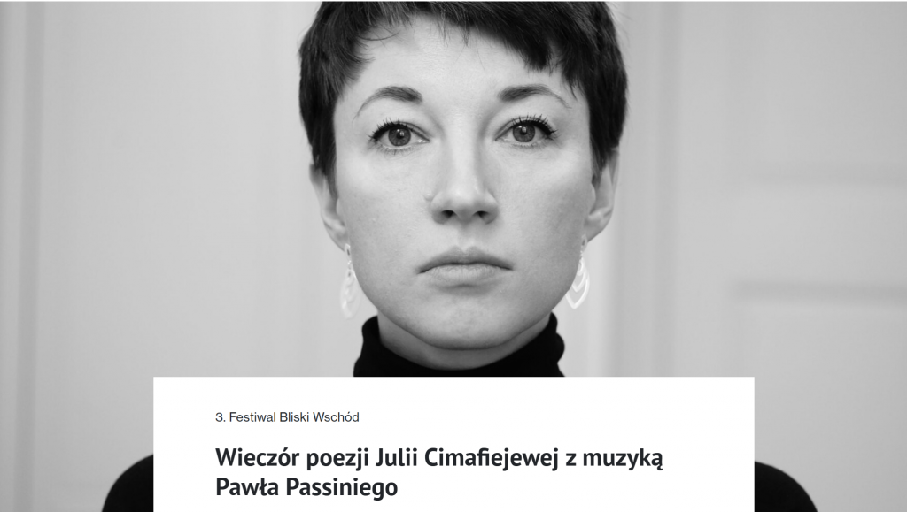 14 СНЕЖНЯ ў Любліне ў межах фестывалю “Блізкі Усход” пройдзе вечар паэзіі Юлі Цімафеевай з музыкай Паўла Пасіні. Сёлетняя назва фестывалю “Стратэгічны лес” адсылае да другой часткі раману Альгерда Бахарэвіча “Сабакі Эўропы”. З поўнай праграмай можна азнаёміцца тут.