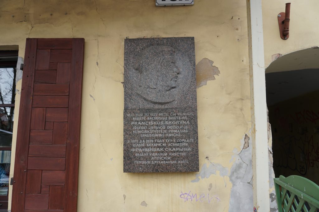У гонар Францыска Скарыны на доме па вул. Вялікай, 19 (літ. — Didžioji g.) усталявана мемарыяльная дошка. Тут жа, у дворыку, знаходзіцца скульптура летапісца, якая таксама прысвечана першадрукару. Стварыў помнік скульптар Вацлавас Круцініс у 1973 годзе.