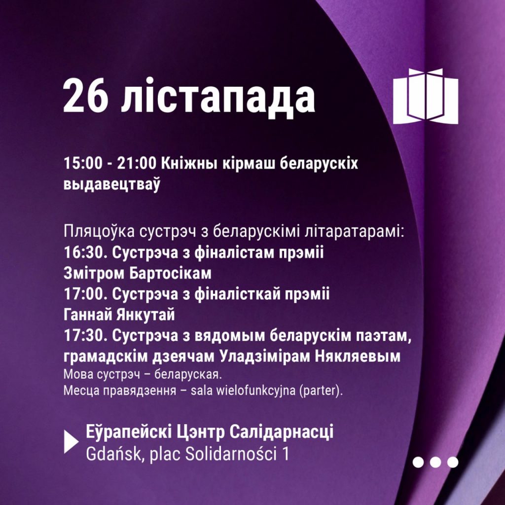Усе мерапрыемствы пройдуць у Еўрапейскім цэнтры салідарнасці (Europejskie Centrum Solidarności, pI. Solidarności 1), паведамляе Беларускі ПЭН.