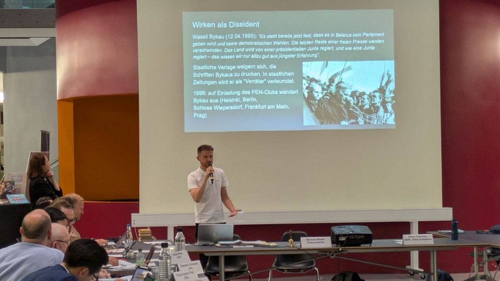 Перад галасаваннем, якое адбылося на пасяджэнні 2 верасня, сябры арганізацыі RAZAM e.V. Яўгенія Гукава і Алесь Маісеенка расказалаі дэпутатам горада пра жыццёвы шлях і творчасць класіка беларускай літаратуры.